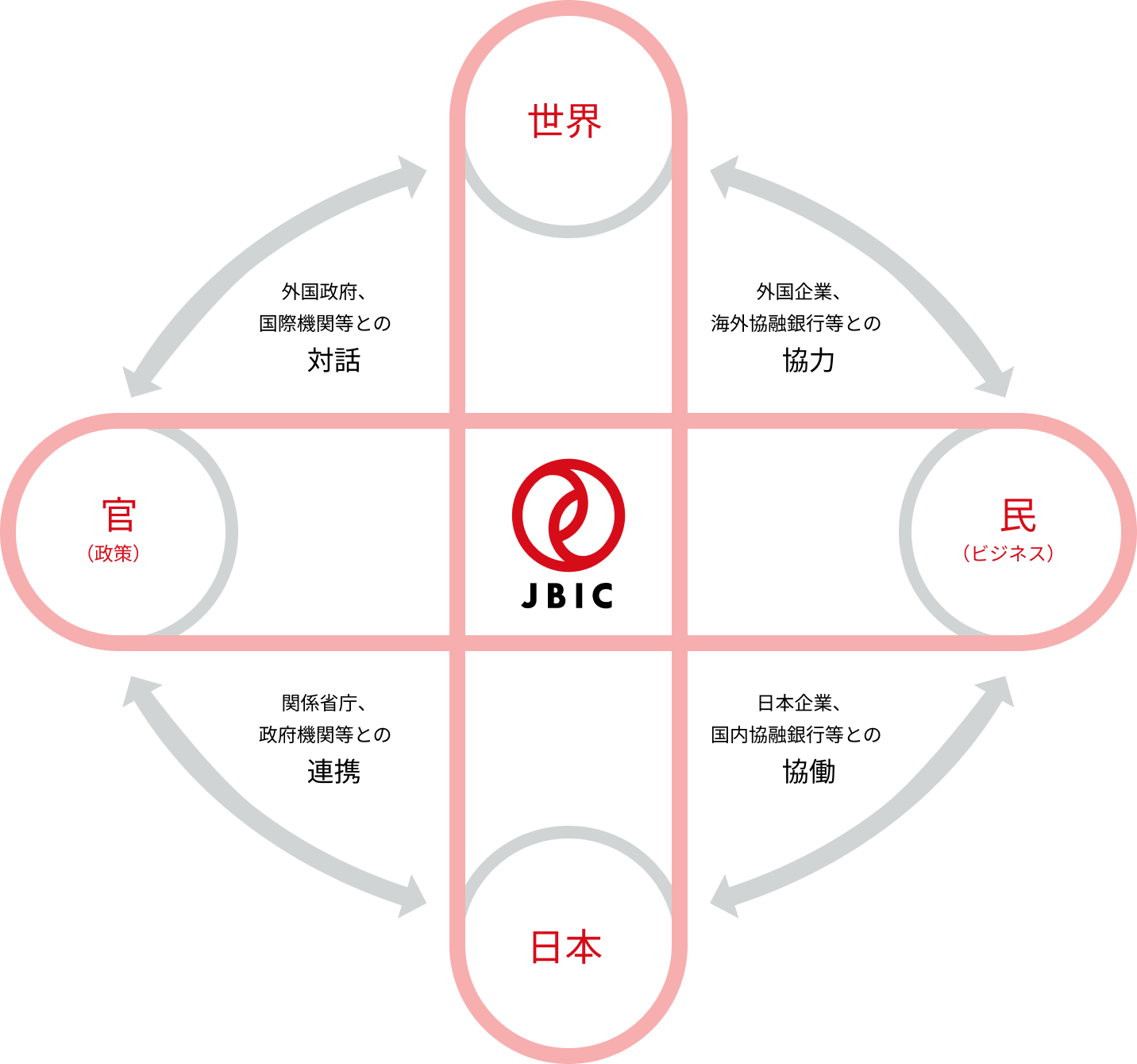 経済成長や豊かな暮らしのために資源開発、インフラ整備などを推し進める「世界の国々」と、長期安定的な資源の確保や国際競争力の維持・向上を図る「日本」。社会課題に取り組む「日本政府、外国政府」と、海外の成長を取り込んでビジネスを拡大したい「日本企業」。それぞれのニーズをつなぐ海外プロジェクトを、多様な金融スキームや高度な知見を駆使して支援しているのがJBICです。他の組織、企業とは異なる独自の立ち位置で、日本および国際経済社会の健全な発展に貢献しています。