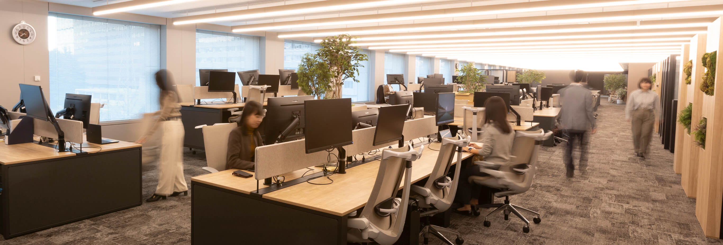 JBICではコロナ禍を経て、オフィスワークとテレワークを組み合わせたハイブリッドによる働き方が定着しました。また、文書・手続きの電子化が進み、これまで紙媒体を保管していたスペースの減少も見込まれるようになりました。こうした中、職員同士のコミュニケーションの活性化と空間の有効活用に着目し、オフィスレイアウトを全面的に刷新。2024年には職員がデスクワークを行っている執務フロアが、木の温もりとグリーンの癒し、柔らかな光に満たされた空間へと生まれ変わりました。