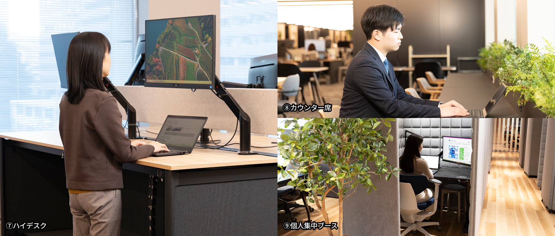 出社時により快適な環境で高い生産性を発揮できるよう、デスク環境を改善しました。集中しやすく体への負担も少ないとされるスタンディングワークができるよう、全デスクの約3割には「ハイデスク」を採用。各デスクに設置されたモニターをノートパソコンと接続し「デュアルモニター」にすれば業務効率化にもつながります。